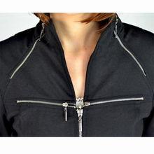 这款拉链上衣的设计非常独特,打破了传统上衣的常规。它采用了拉链作为主要的装饰元素,将拉链巧妙地融入衣身,既实用又时尚。上衣的版型宽松,穿着舒适,而且拉链的设计让整件衣服看起来更加有层次感。